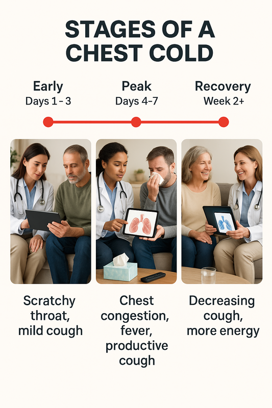 If you’re wondering how long does a chest cold last, most cases follow a predictable pattern over 1–2 weeks. Understanding the stages of a chest cold can help you know what’s normal, when symptoms typically peak, and when to seek medical care.